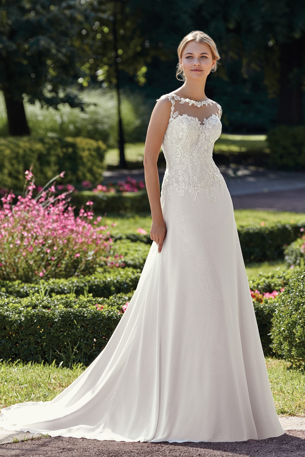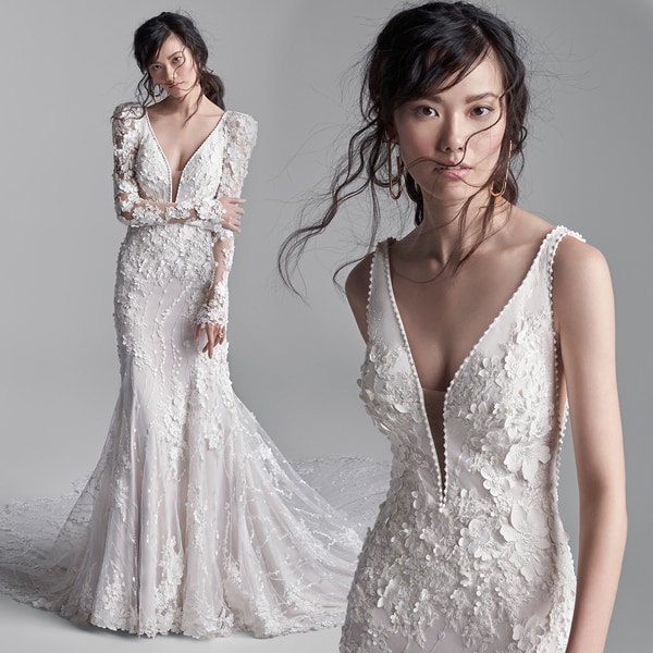 Per le spose con il fisico a pera perché mettono in risalto le spalle minute e la vita stretta. Il focus sul punto vita valorizza anche il body shape rettangolare, conferendo armonia alla figura. Questi abiti scivolati sono adatti anche per le spose curvy, le gonne leggere e poco voluminose non segnano e slanciano la linea.