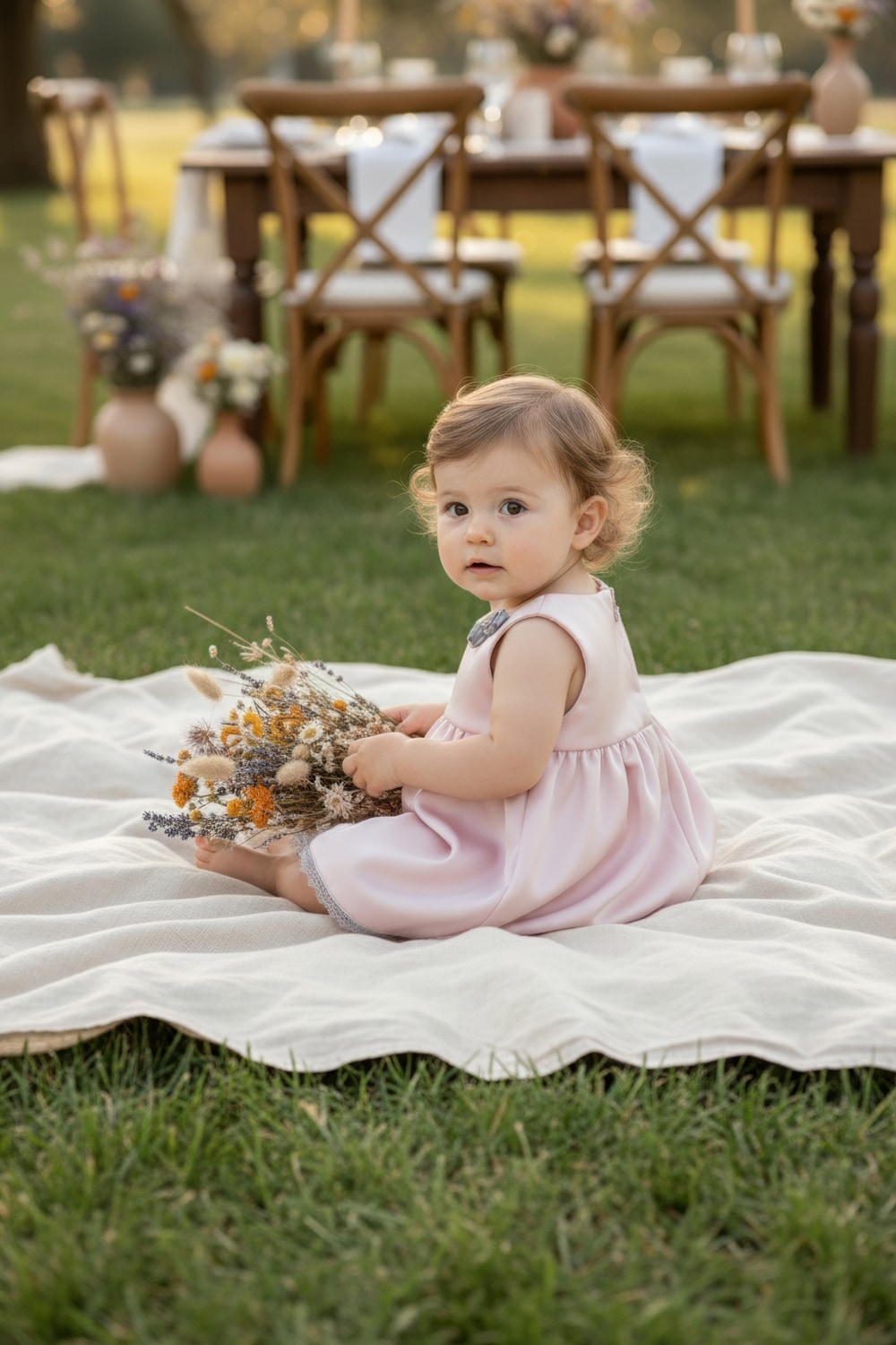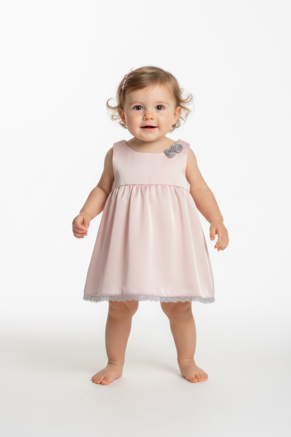 Abito con corpetto e gonna in cady di seta. Colore: rosa Dettagli: pizzo sul fondo della gonna e roselline di colore grigio Composizione 100% seta Circonferenza cm.55 Lunghezza dalla spalla cm. 41 Realizzato nella nostra sartoria con prodotti e materiali 100% Made in Italy